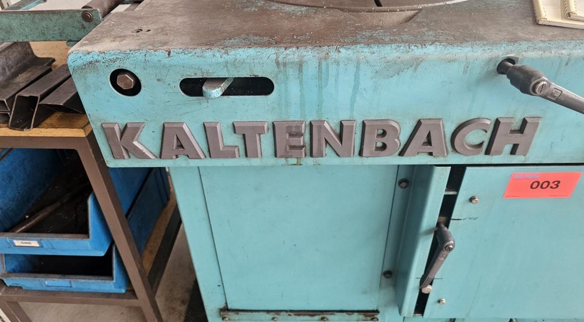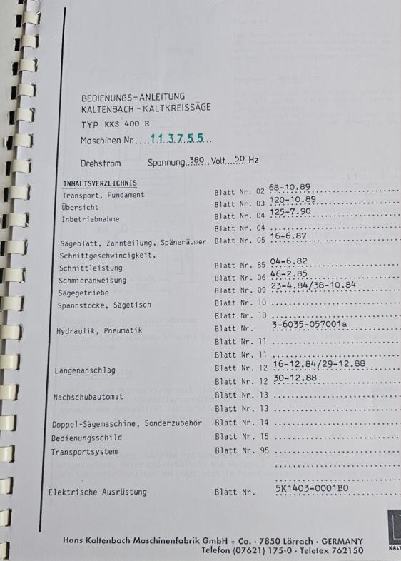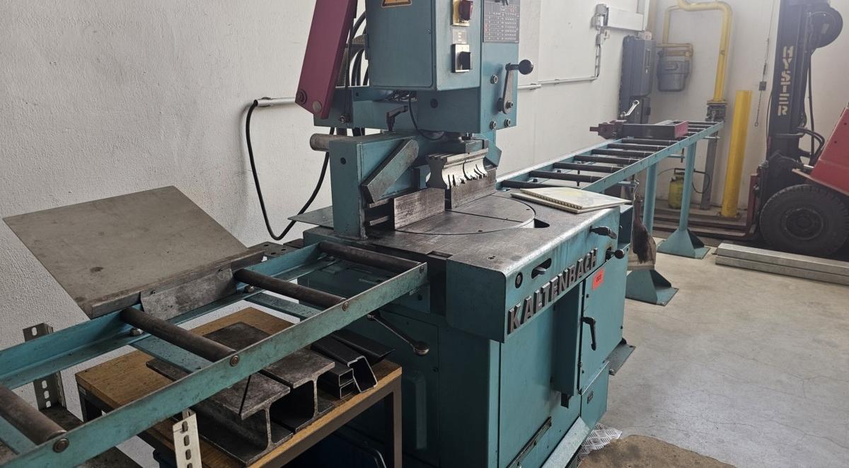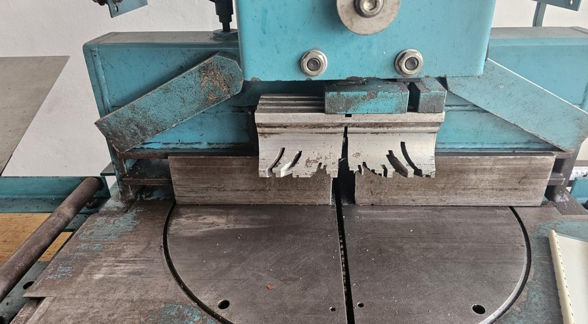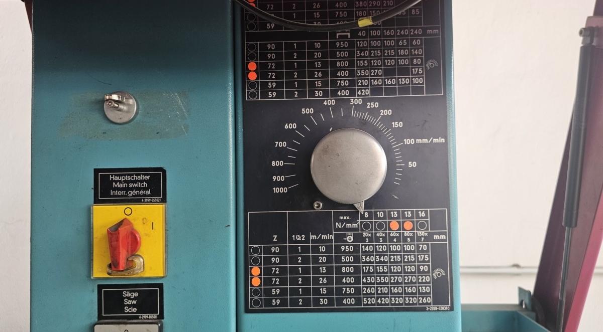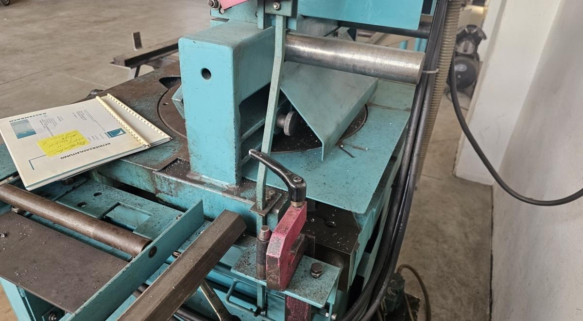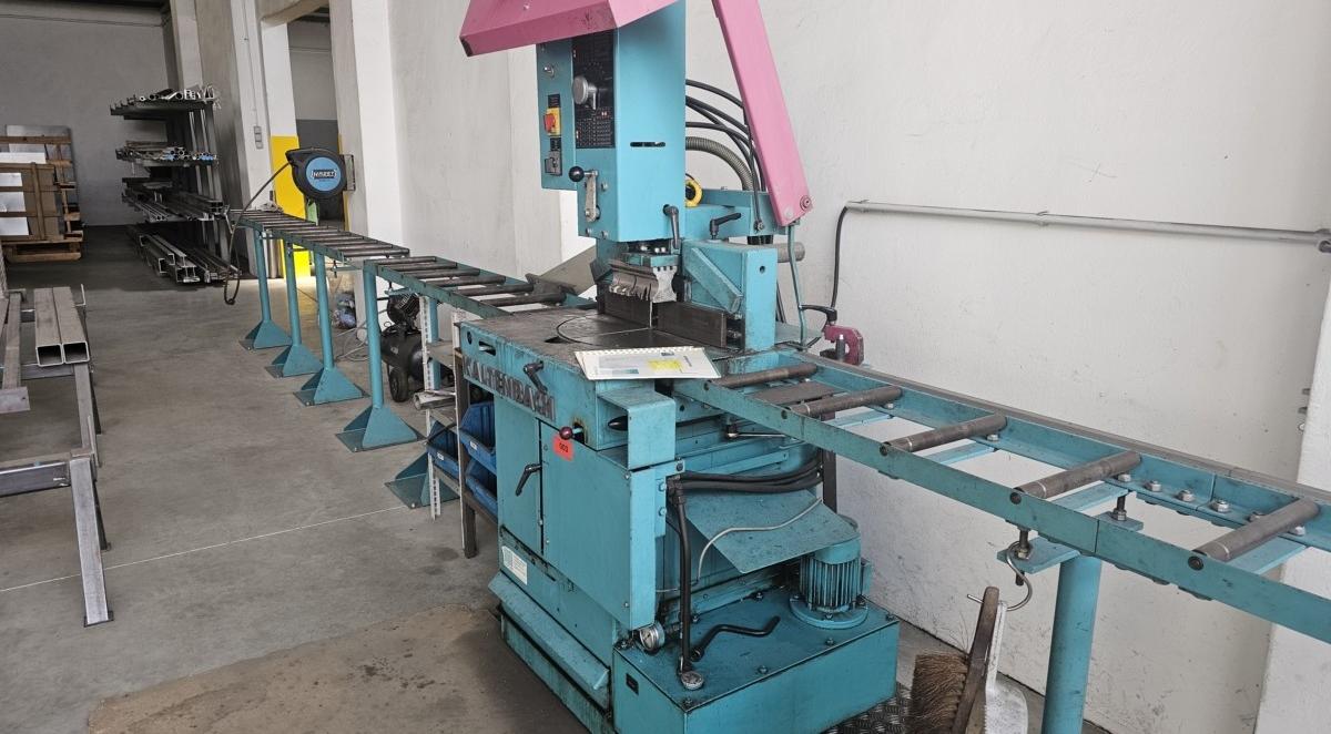 Machine has angle cutting arrangement +/- 45°, is semi automatic without material infeed.